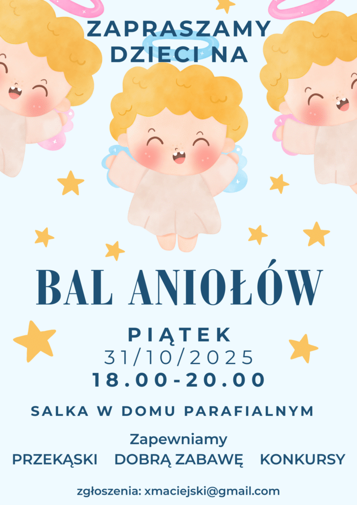 Bal Aniołów Serdecznie zapraszamy dzieci na BAL ANIOŁÓW, który odbędzie się w piątek 31.10 w godz. 18-20.00 w domu parafialnym. Zachęcamy do przebrania się za aniołki. Informacje i zgłoszenia u ks. Macieja.